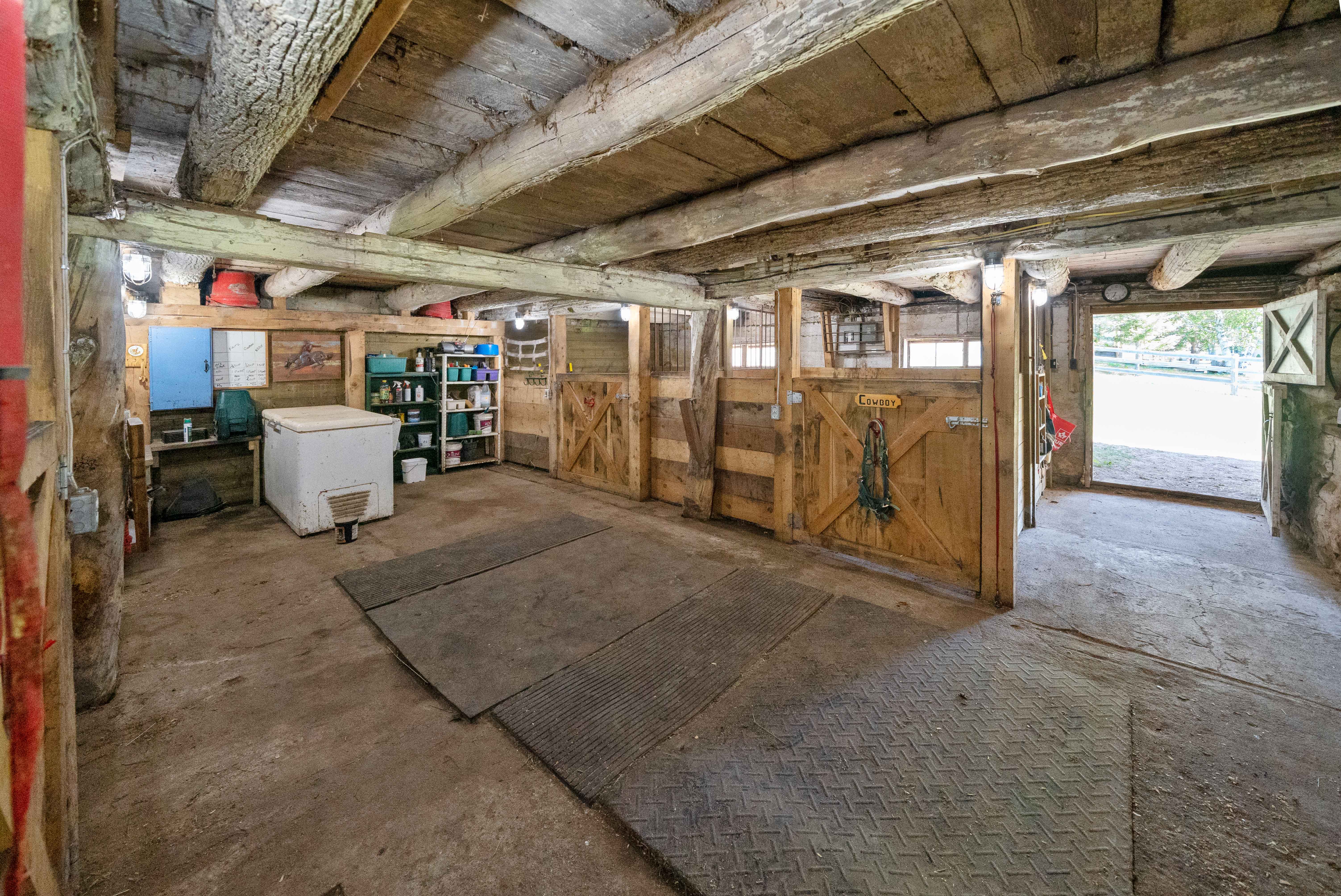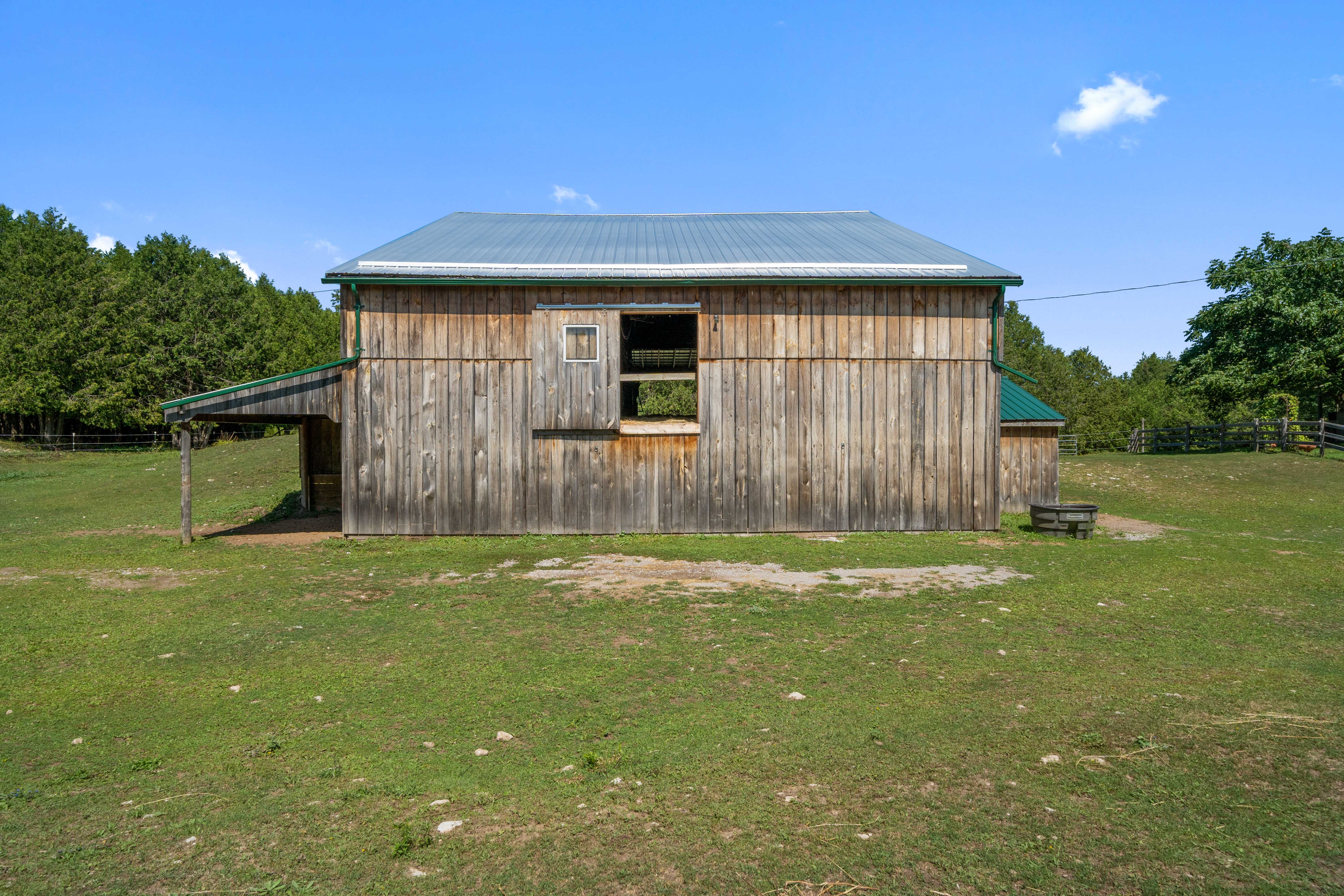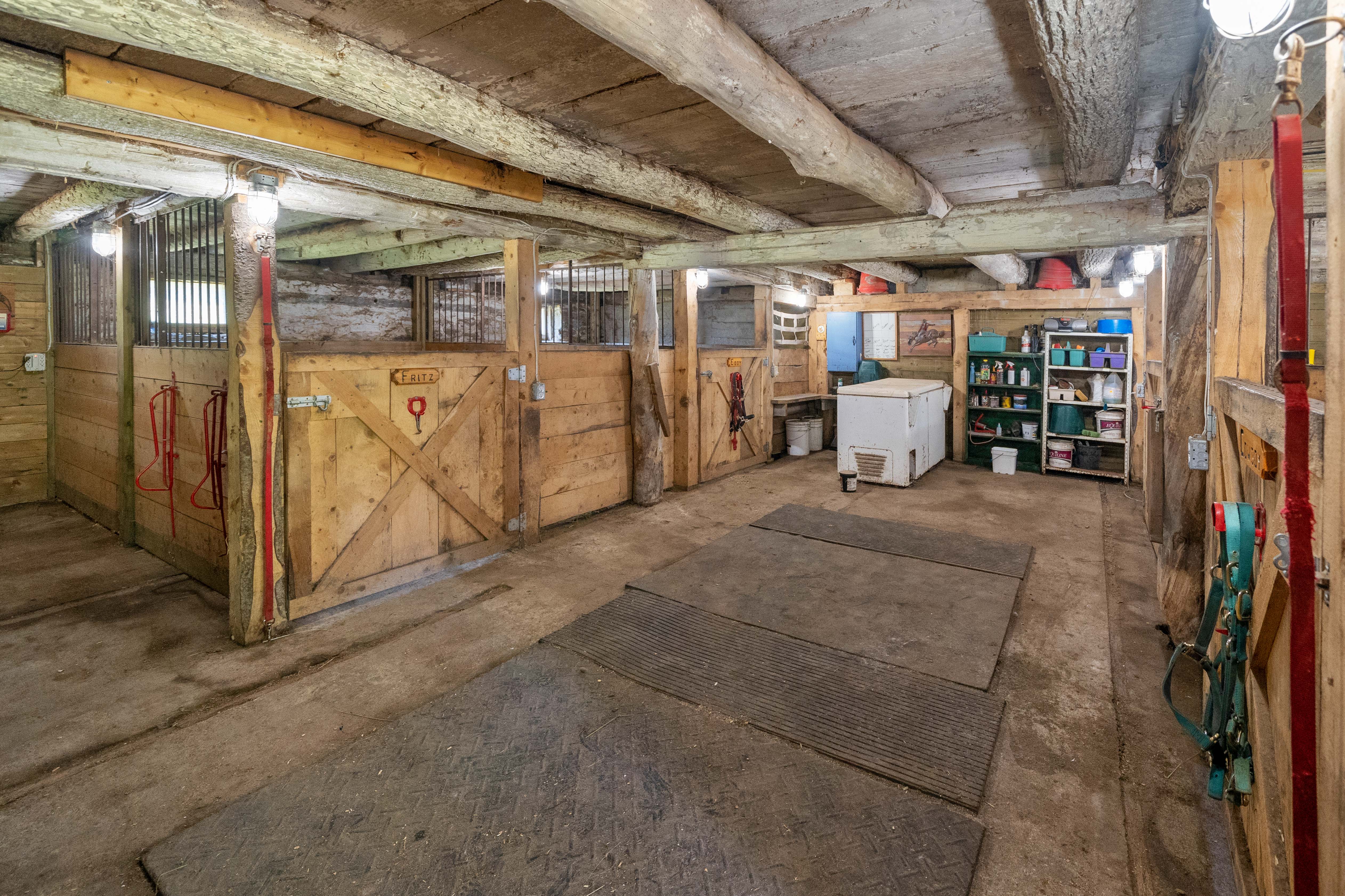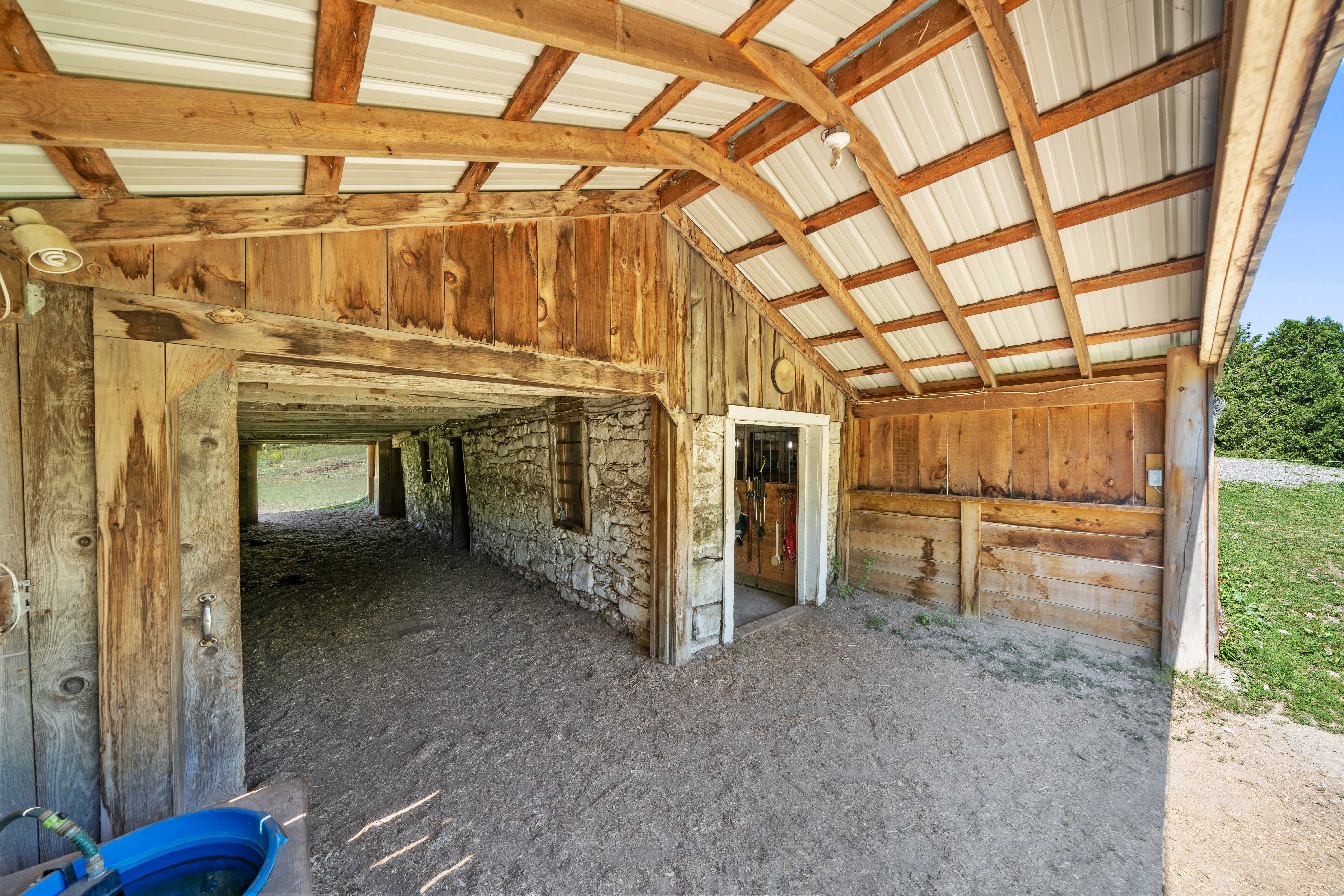 Currently set up for horses, the 4 stall barn has been lovingly maintained and upgraded to ensure longevity and usability! Indoor feed storage, heated tack room, implement storage as well as run in lean-to space for the animals!