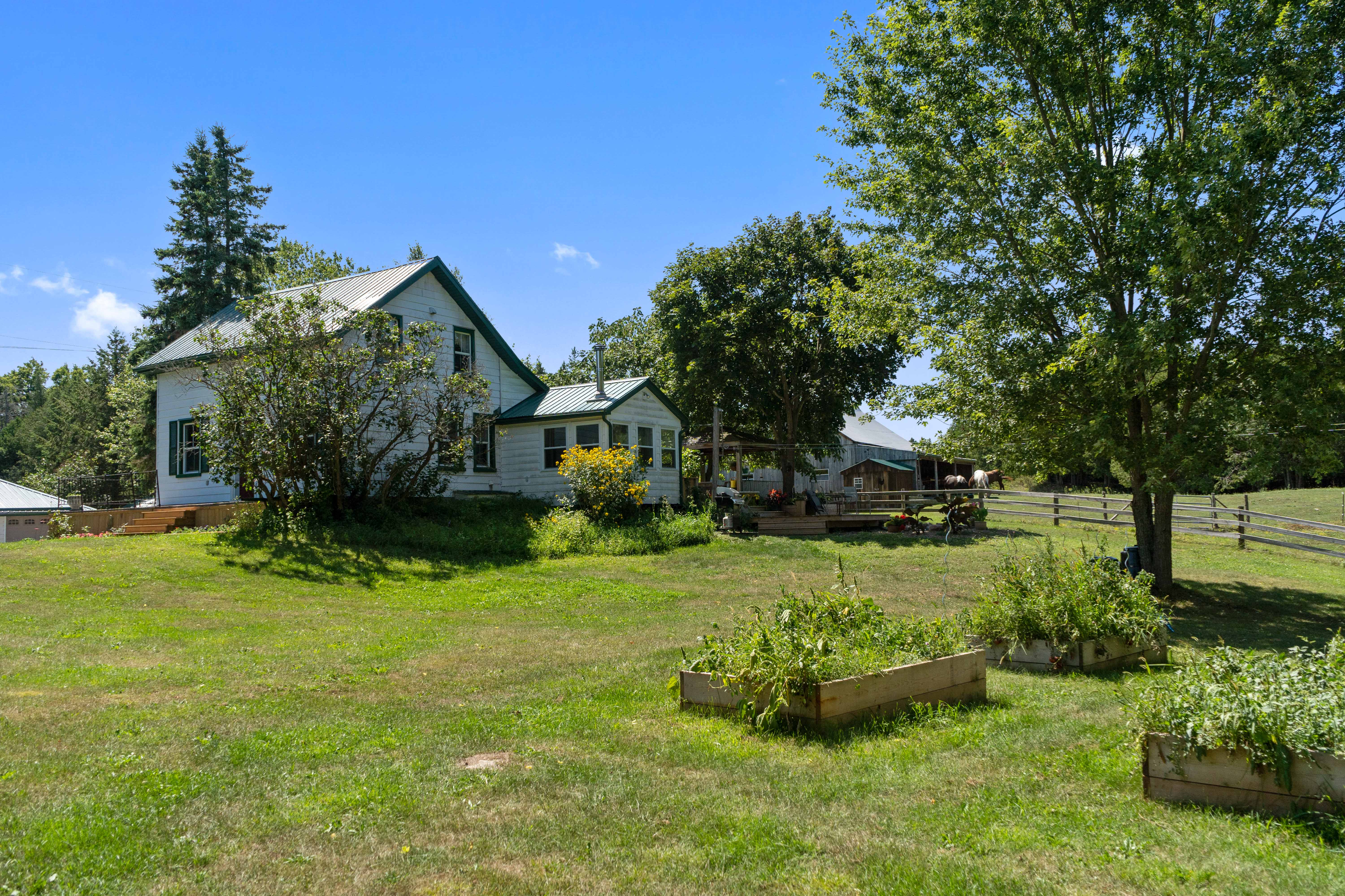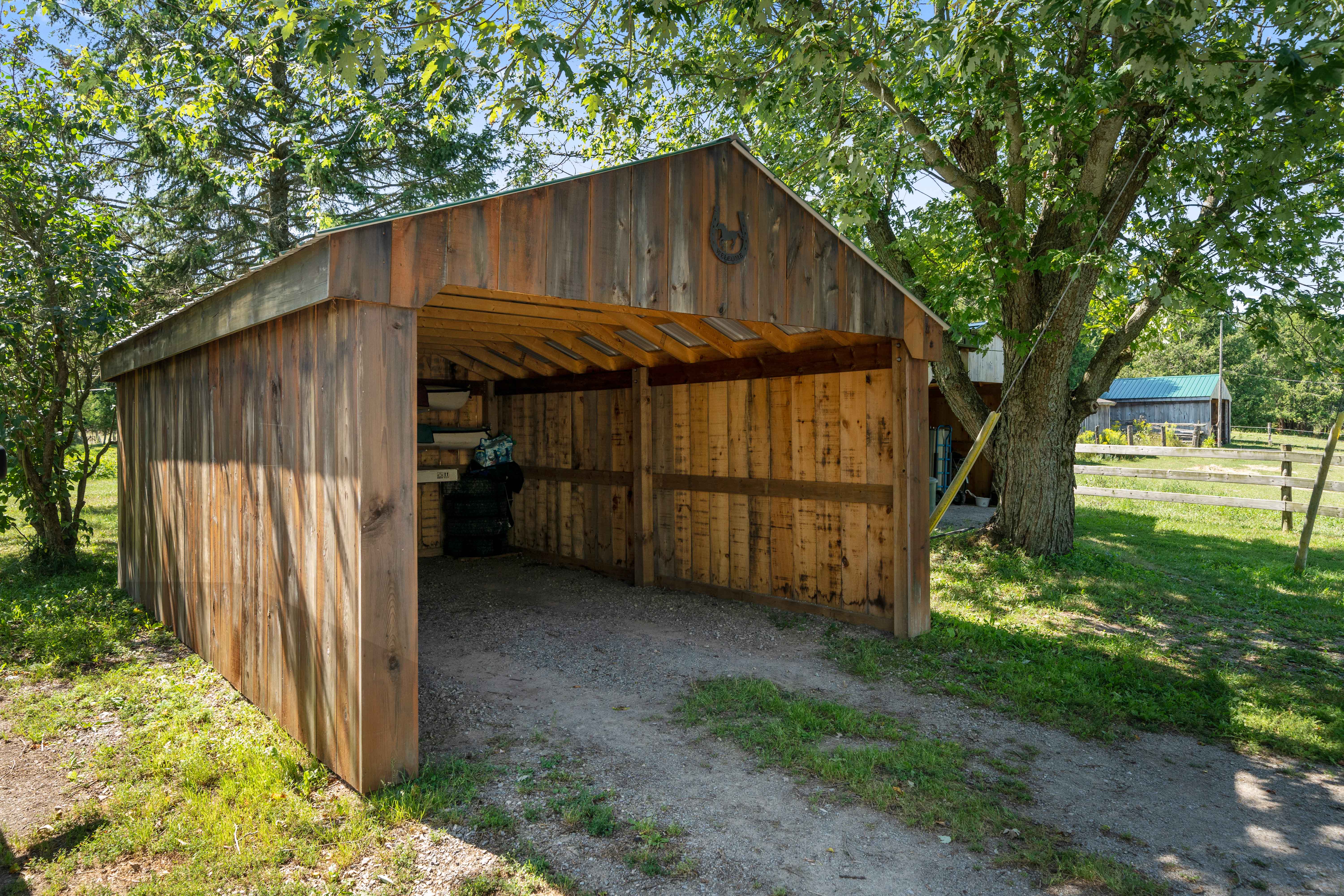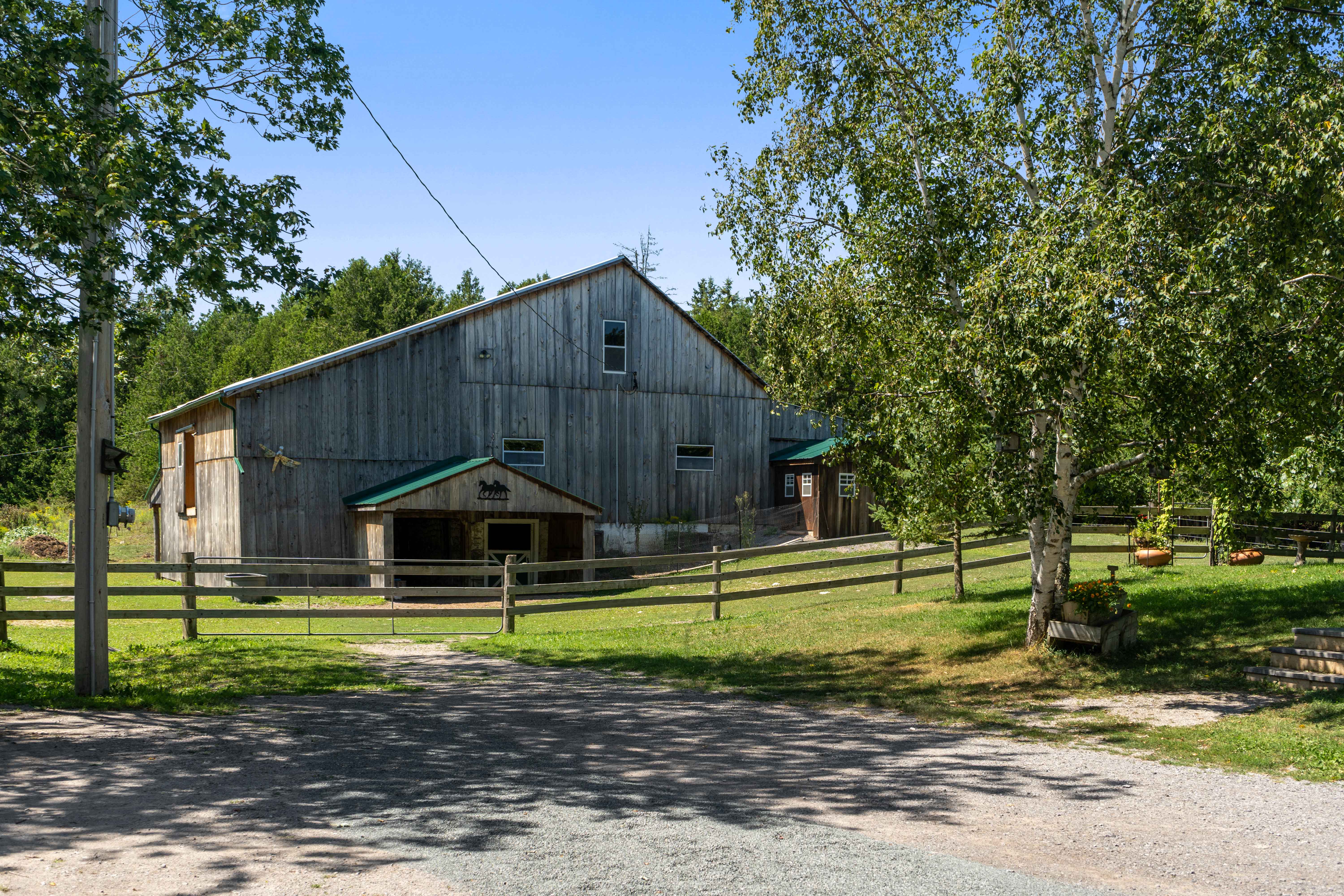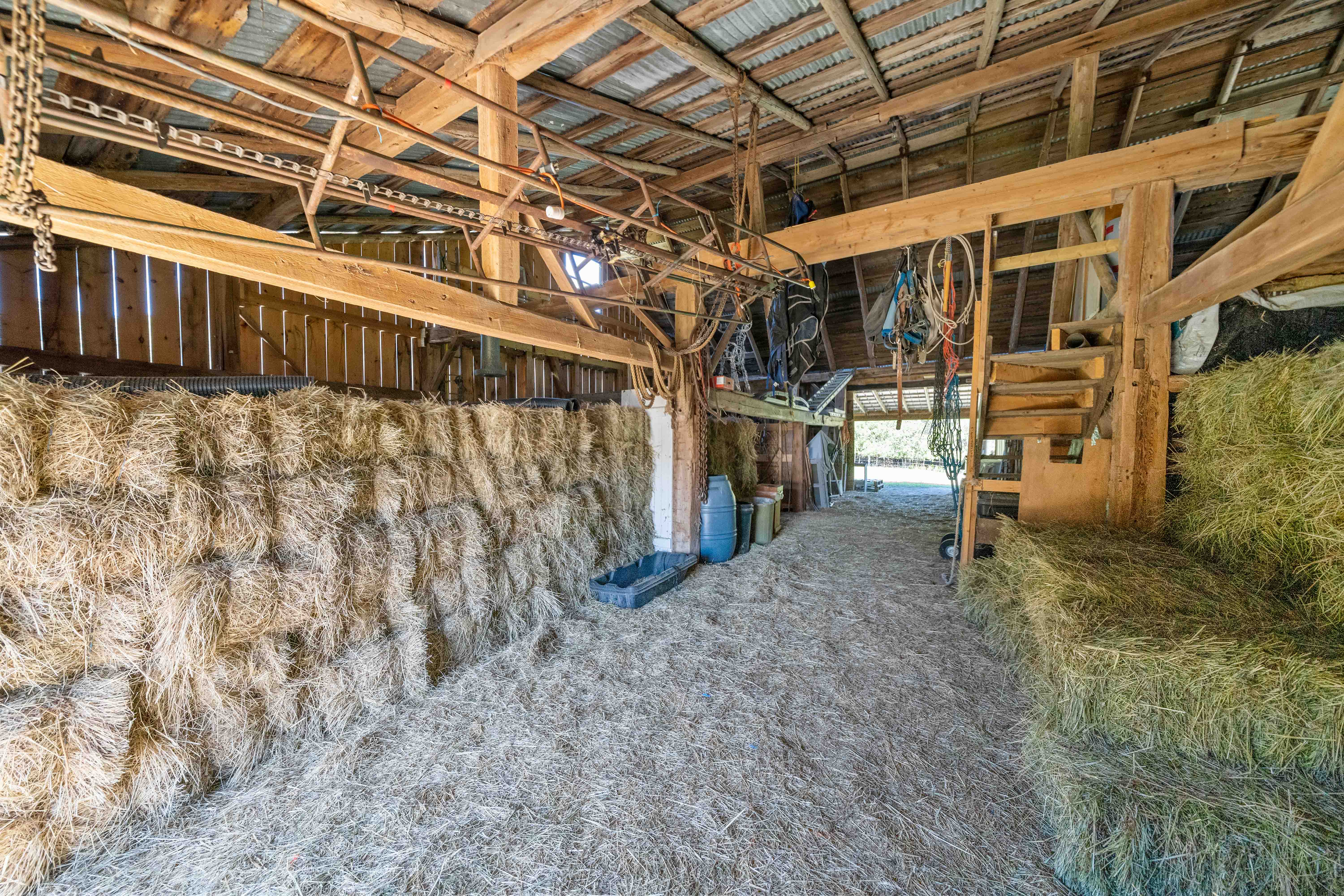 Currently set up for horses, the 4 stall barn has been lovingly maintained and upgraded to ensure longevity and usability! Indoor feed storage, heated tack room, implement storage as well as run in lean-to space for the animals!